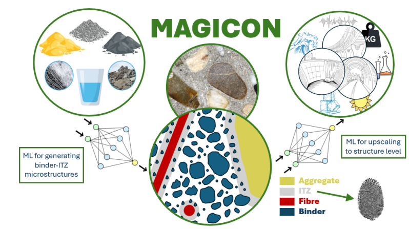 MAGICON will focus on the 'connection' between the ingredients, the ITZ (interfacial transition zone) between aggregate particles (or sand and fibres) and the binder. We are not only going to characterize this ITZ with microscopy and CT-scanning, but we are also going to measure mechanical and transport properties on a micrometre scale. By combining experiments, computational modelling and AI with big data we will develop a new strategy to make it possible to design safely with our (future) green concretes.